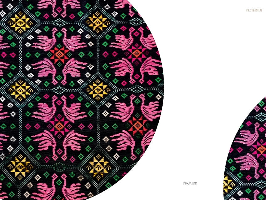 Each piece of Zhuang Brocade is meticulously woven on a traditional loom, using brilliant threads of red, yellow, green, blue, and black to create intricate geometric and floral patterns. The motifs often feature dragons, phoenixes, butterflies, and flowers, symbolizing happiness, prosperity, and harmony.